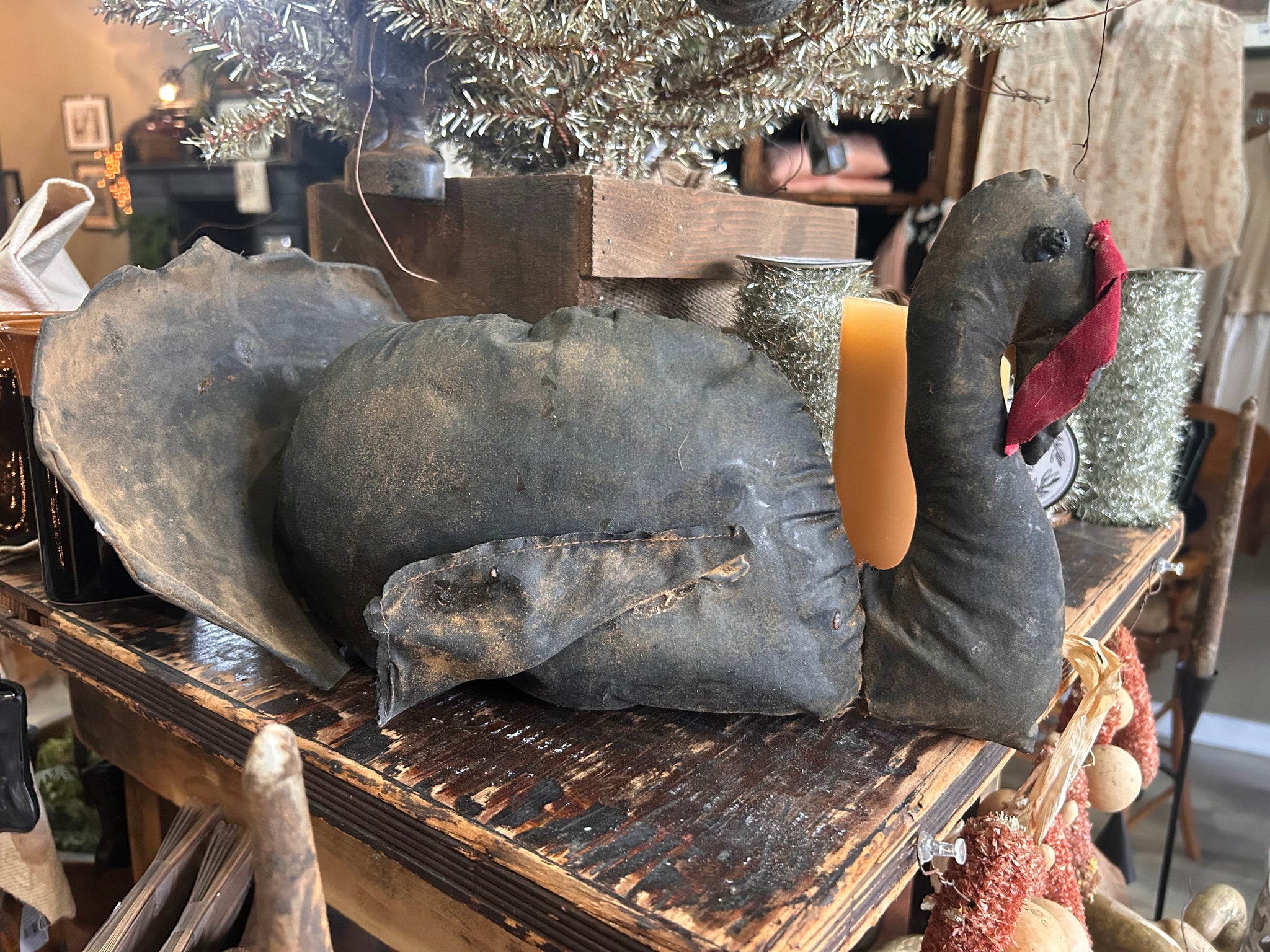 This adorable handcrafted, Turkey is the perfect centerpiece for any holiday gathering. He stretches 14 inches long. Hand drawn pattern. Exclusive to the Cranberry Cornstalk Co. Charcoal starched body is dusted with our grungy prim dusting.